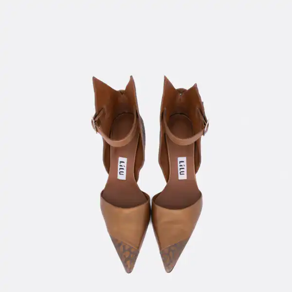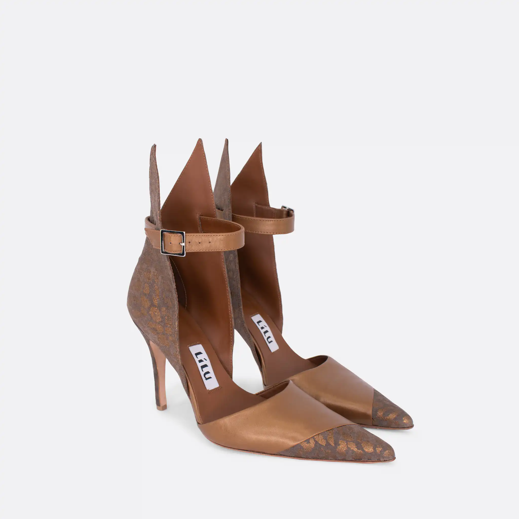 Cipele sa visokom stiklom za proleće, leto i jesen, na kožnom djonu i zbog toga nije preporučeno nositi ih kada su lošije vremenske prilike. Visina štikle je 10cm. U pitanju je ručna izrada obuće. Izradjujemo ih u kombinaciji od bakar/leopard kože, a za naručivanje u posebnim bojama kontaktirajte nas.