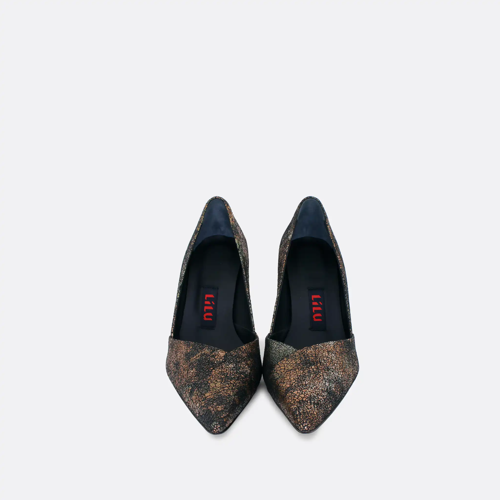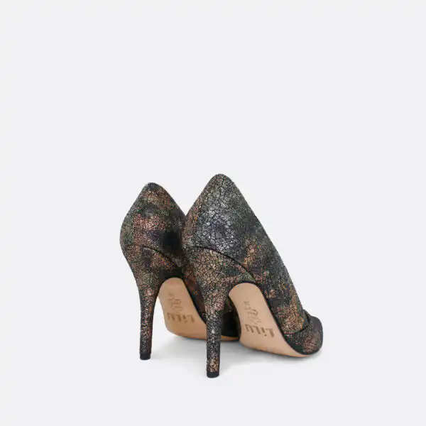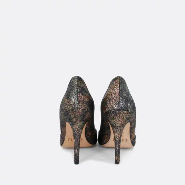 Špicaste elegantne cipele sa visokom štiklom od 10 cm, za sve sezone, na djonu od kože i zbog toga nijepoželjno nositi ih kada su lošije vremenske prilike. U pitanju je ručna izrada obuće u malim, limitiranim serijama. Izradjujemo ih od bakarne ispucale kože. I postava je kožna. Štikla je presvučena u istu kožu od koje se radi i model. Za naručivanje u posebnim bojama kontaktirajte nas putem e-mail-a.