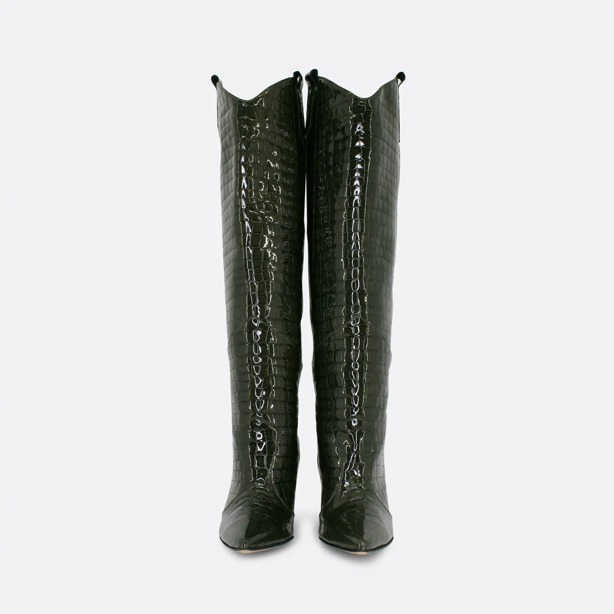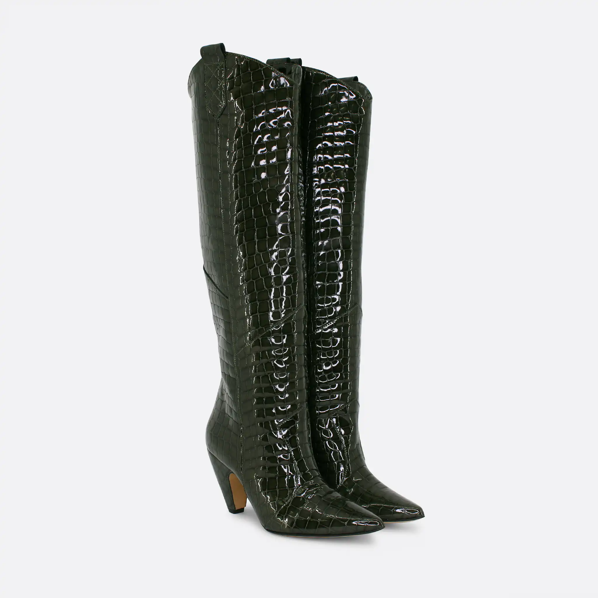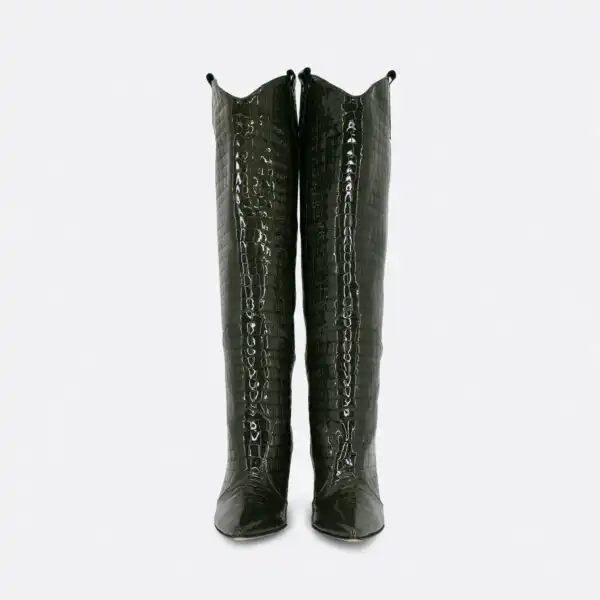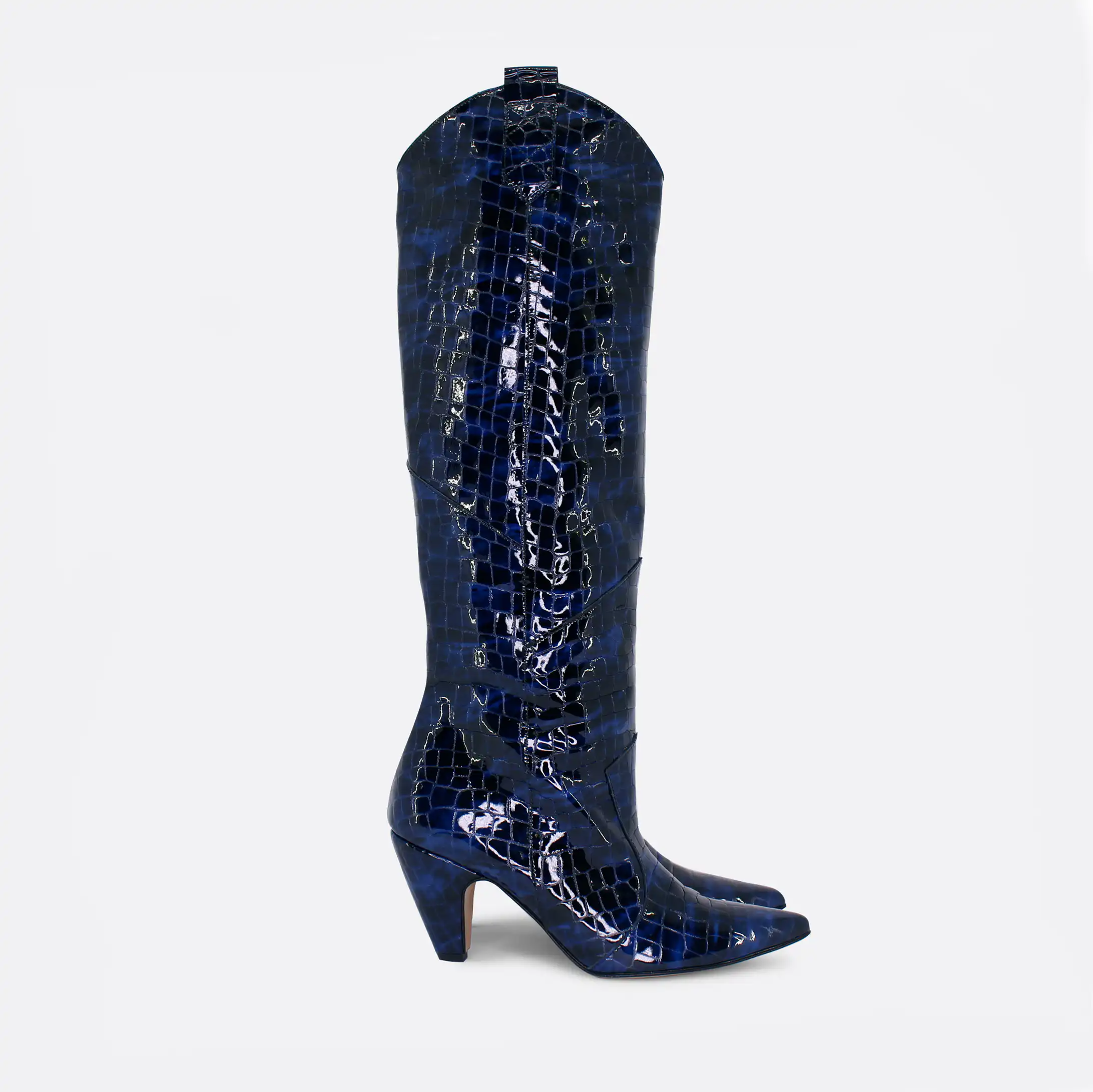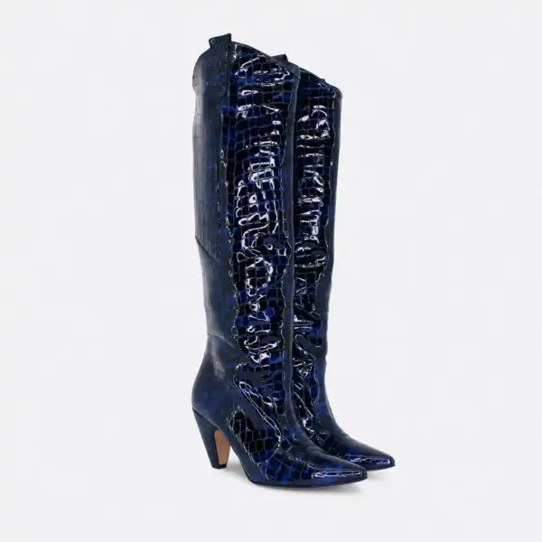 Duge čizme do kolena, sa debljom štiklom 8 cm za sve sezone, na djonu su od kože i zbog toga nije poželjnonositi ih kada su lošije vremenske prilike. U pitanju je ručna izrada obuće. Izradjujemo ih od maslinastog i teget kroko laka. Postava je kožna. Za naručivanje u posebnim bojama kontaktirajte nas putem e-mail-a.