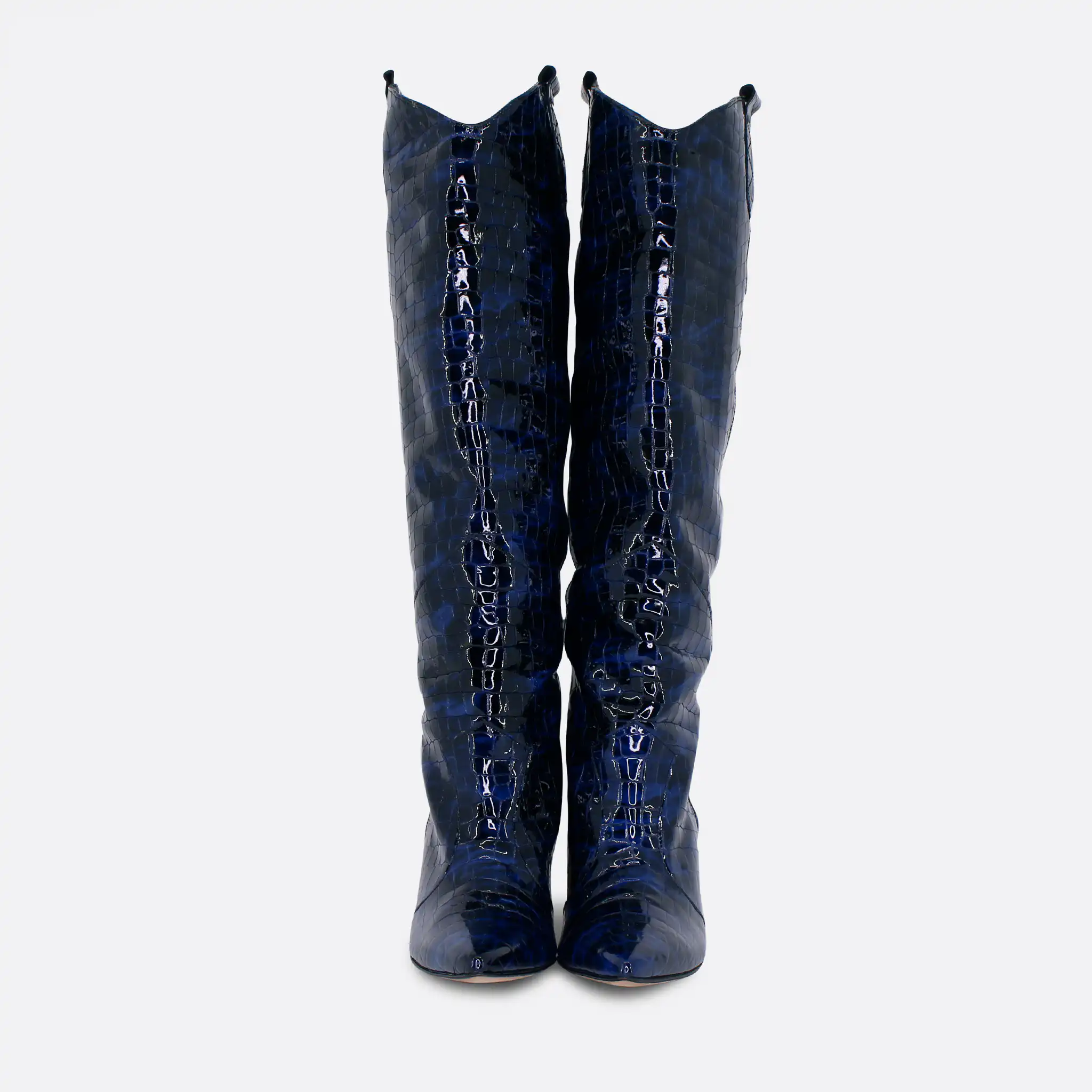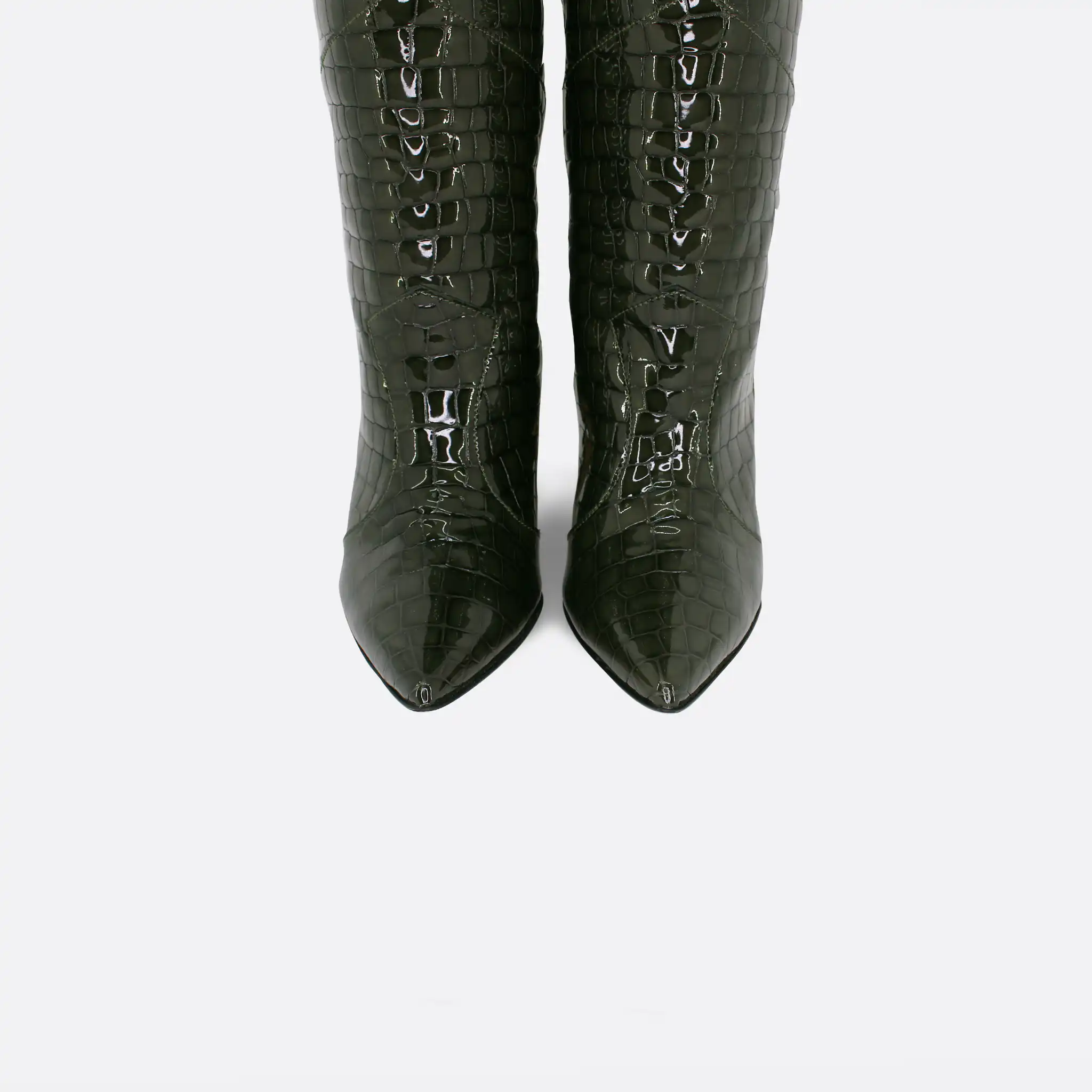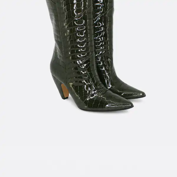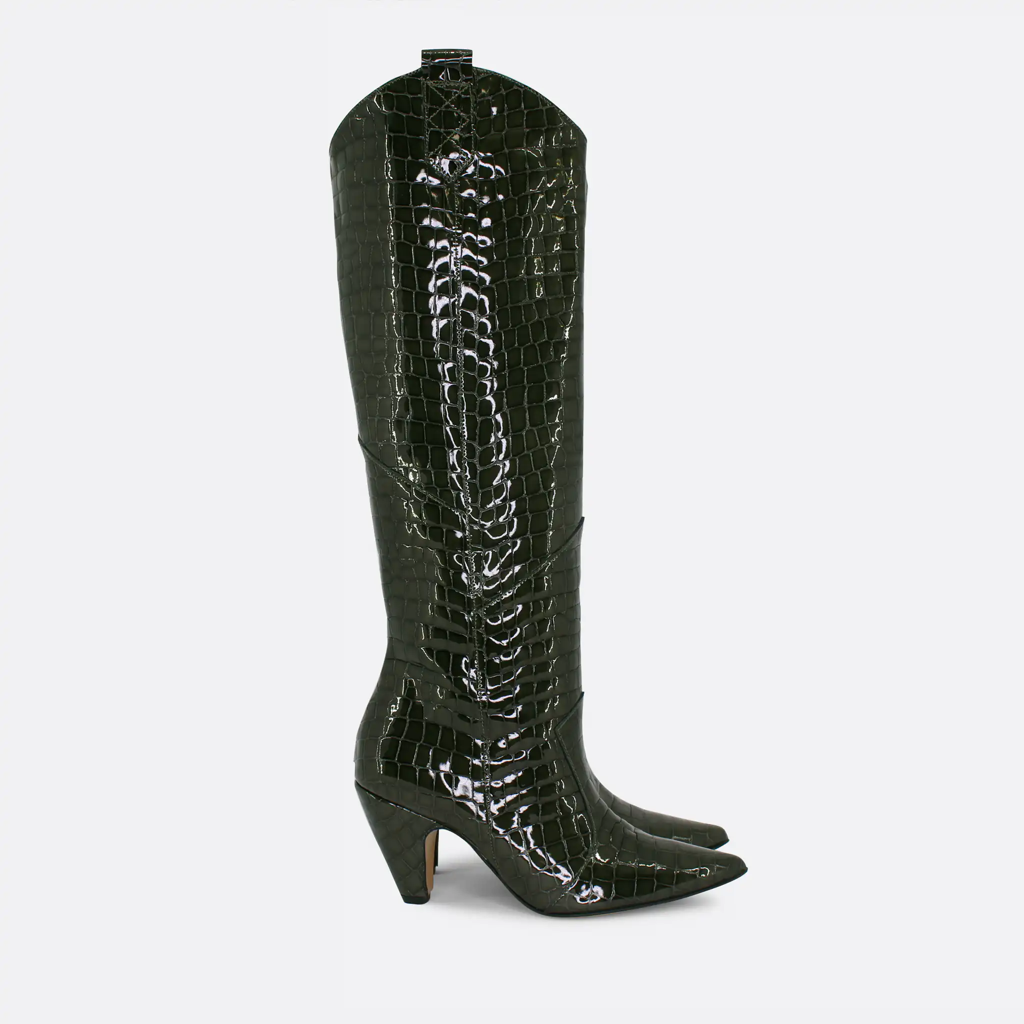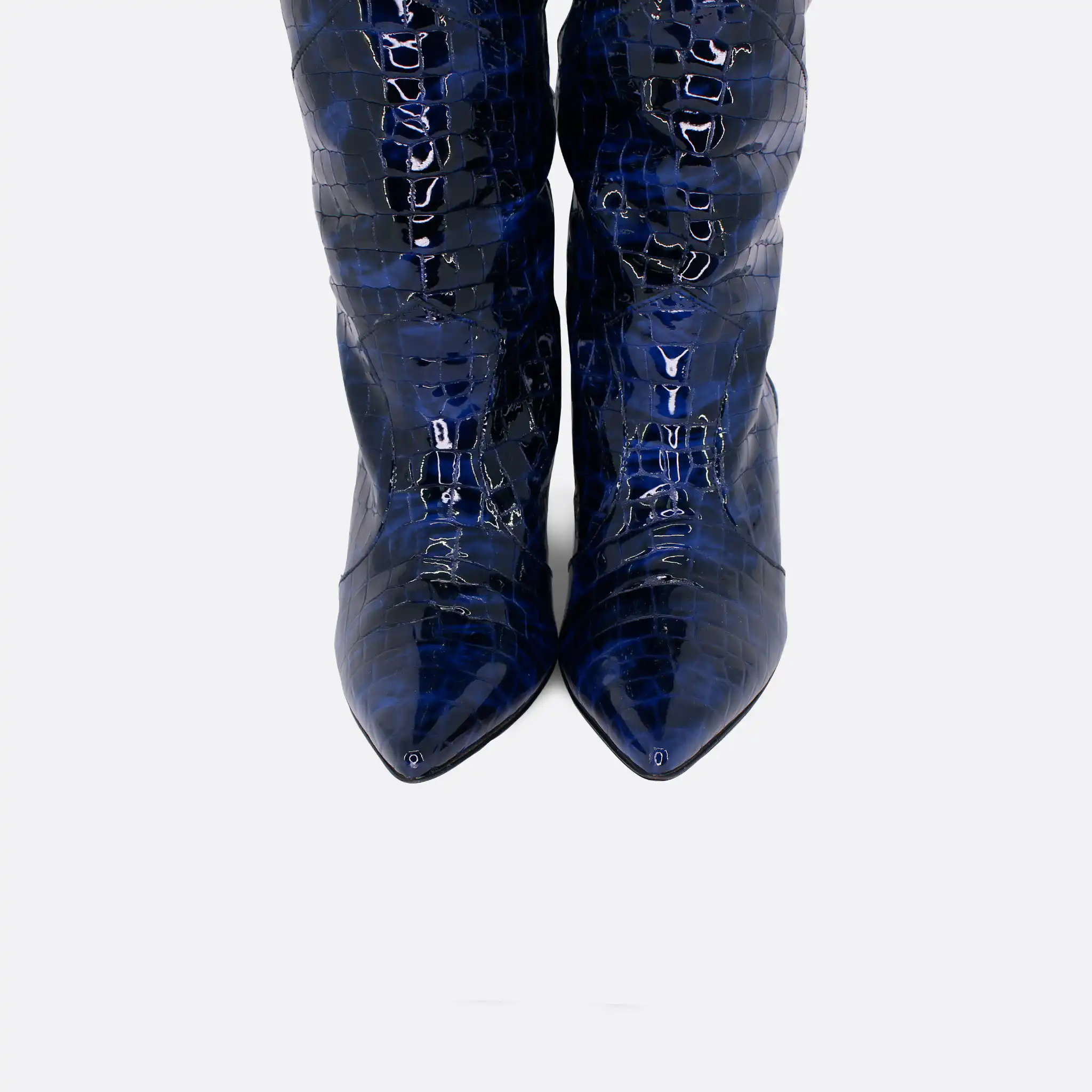 Duge čizme do kolena, sa debljom štiklom 8 cm za sve sezone, na djonu su od kože i zbog toga nije poželjnonositi ih kada su lošije vremenske prilike. U pitanju je ručna izrada obuće. Izradjujemo ih od maslinastog i teget kroko laka. Postava je kožna. Za naručivanje u posebnim bojama kontaktirajte nas putem e-mail-a.
