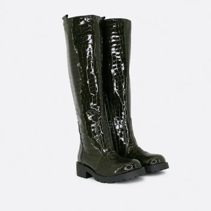 Ravne duge čizme do kolena, sa rajsfešlusom, za jesen i zimu. Čizme imaju gumeni deblji djon i mogu se nositi i kada su lošije vremenske prilike. U pitanju je ručna izrada obuće. Izradjujemo ih od maslinastogi kroko govedjeg laka, kao i od crne i puder govedje glatke kože. Postava je kožna. Za naručivanje u posebnim bojama kontaktirajte nas putem e-mail-a.