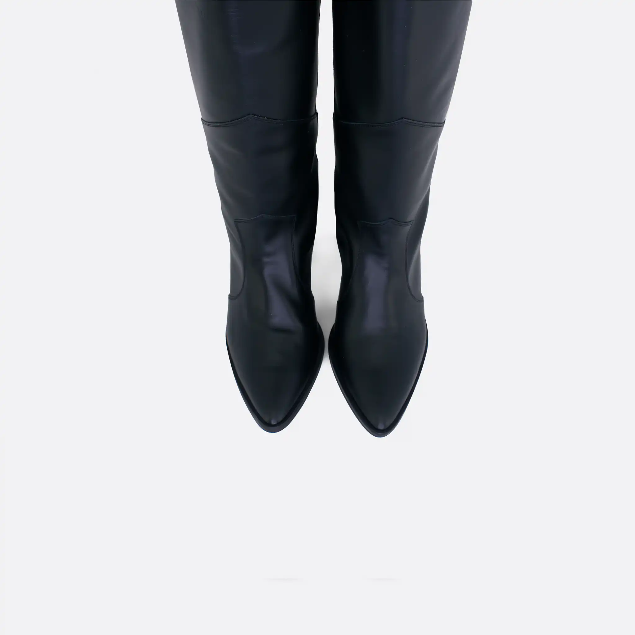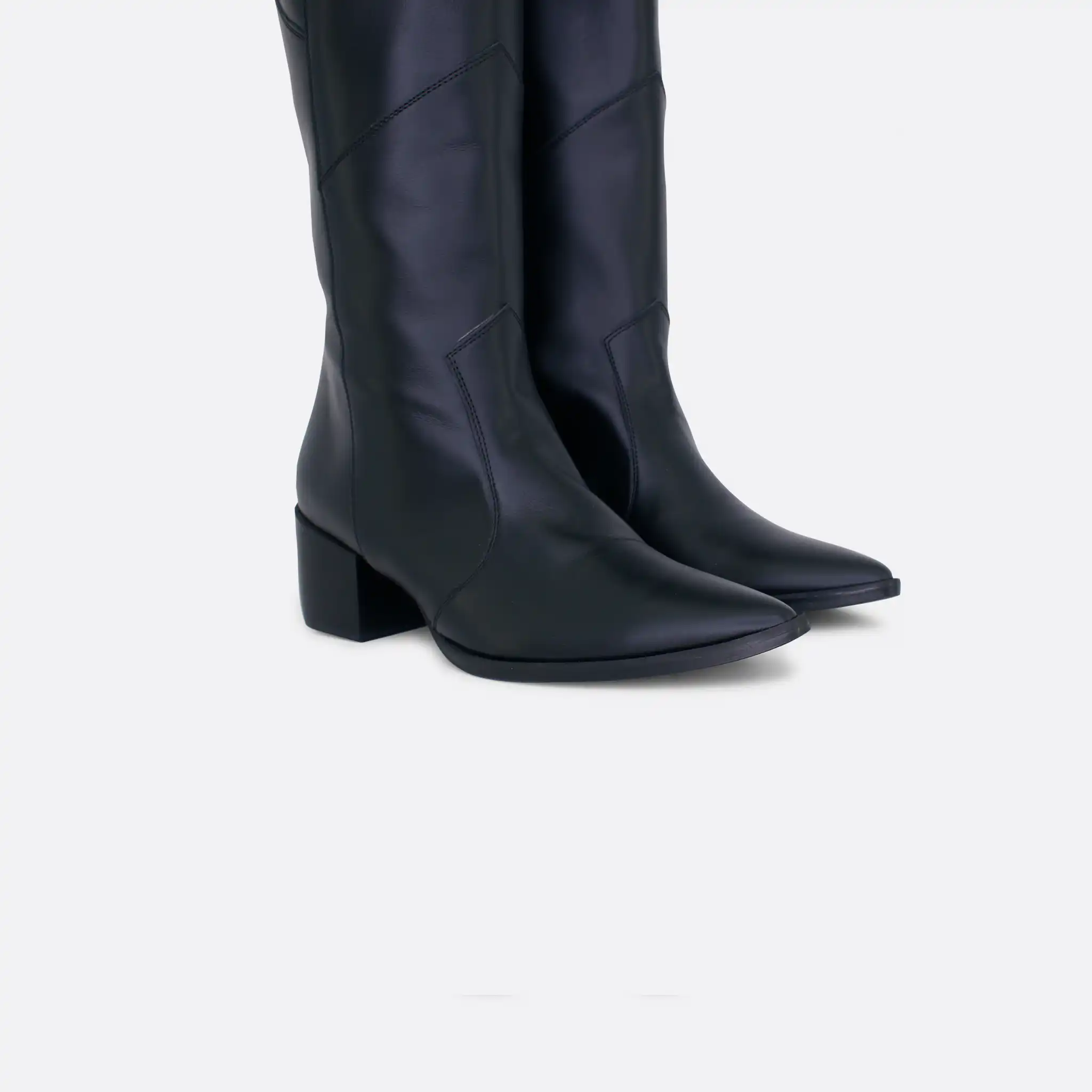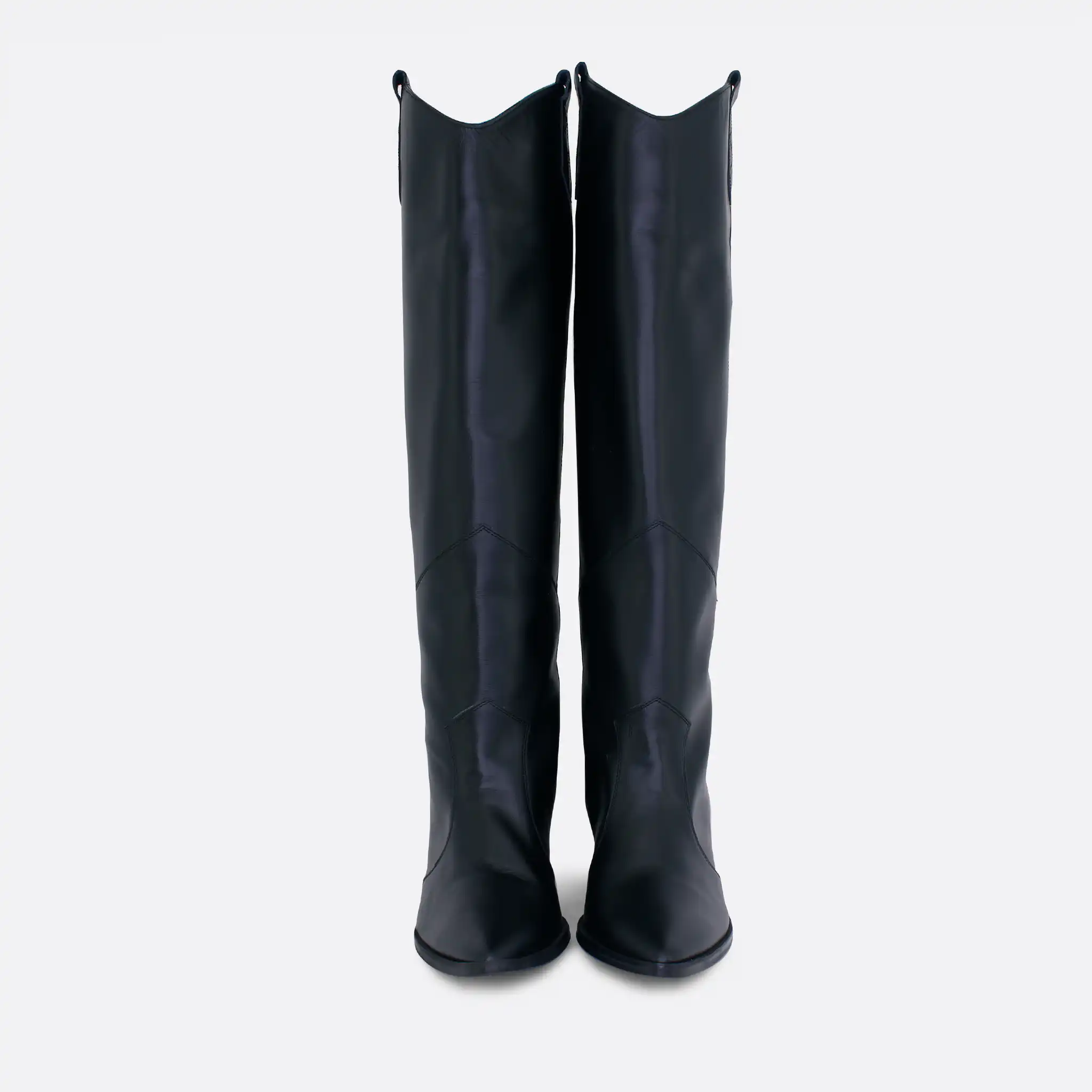 Duge čizmice kaubojke za jesen i zimu, bez rajsfešlusa, na djonu sa kederom. Štikla je drvena koso sečena visine 6 cm. Ovaj model možete nositi i kada su lošije vremenske prilike. Čizme su ručni rad. Izradjujemo ih u crnoj i ljubičastoj govedjoj koži. Postava je kožna. Za narucivanje u posebnim bojama kontaktirajte nas putem e-mail-a.