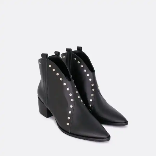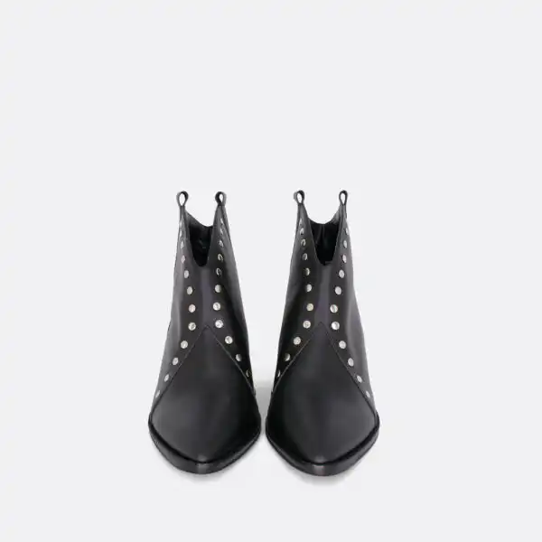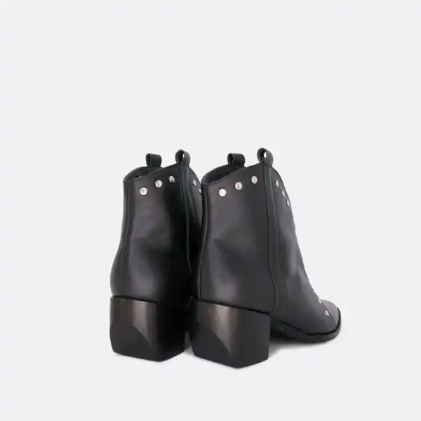 Kratke široke čizmice sa nitnama za sezonu jesen/zima. Postava je kožna. Unutar čizmica je lastiš koji pridržava nogu da bi čizmice bile udobnije pri nošenju. Čizmice su sa djonom i kederom od veštačkog materijala i zbog toga je moguće nositi ih i kada su lošije vremenske prilike. Štikla je 5cm visine i izradjena od drveta. U pitanju je ručna izrada obuće. Serije su limitirane. Proizvodimo ih u crnoj, sivoj, zelenoj i konjak glatkoj koži, a nitne su crne ili srebrne. Za naručivanje u posebnim bojama kontaktirajte nas putem e-mail-a.