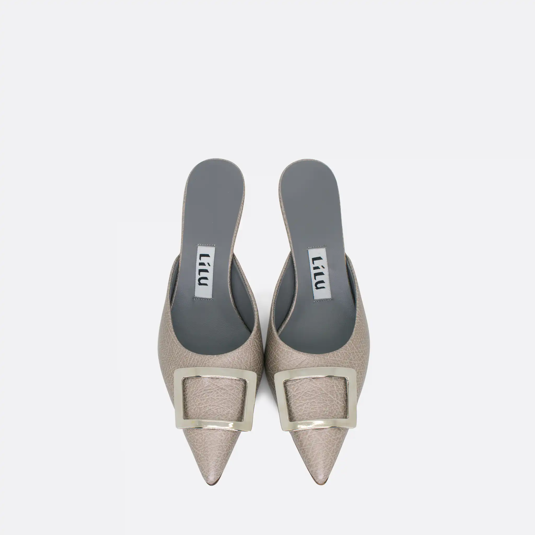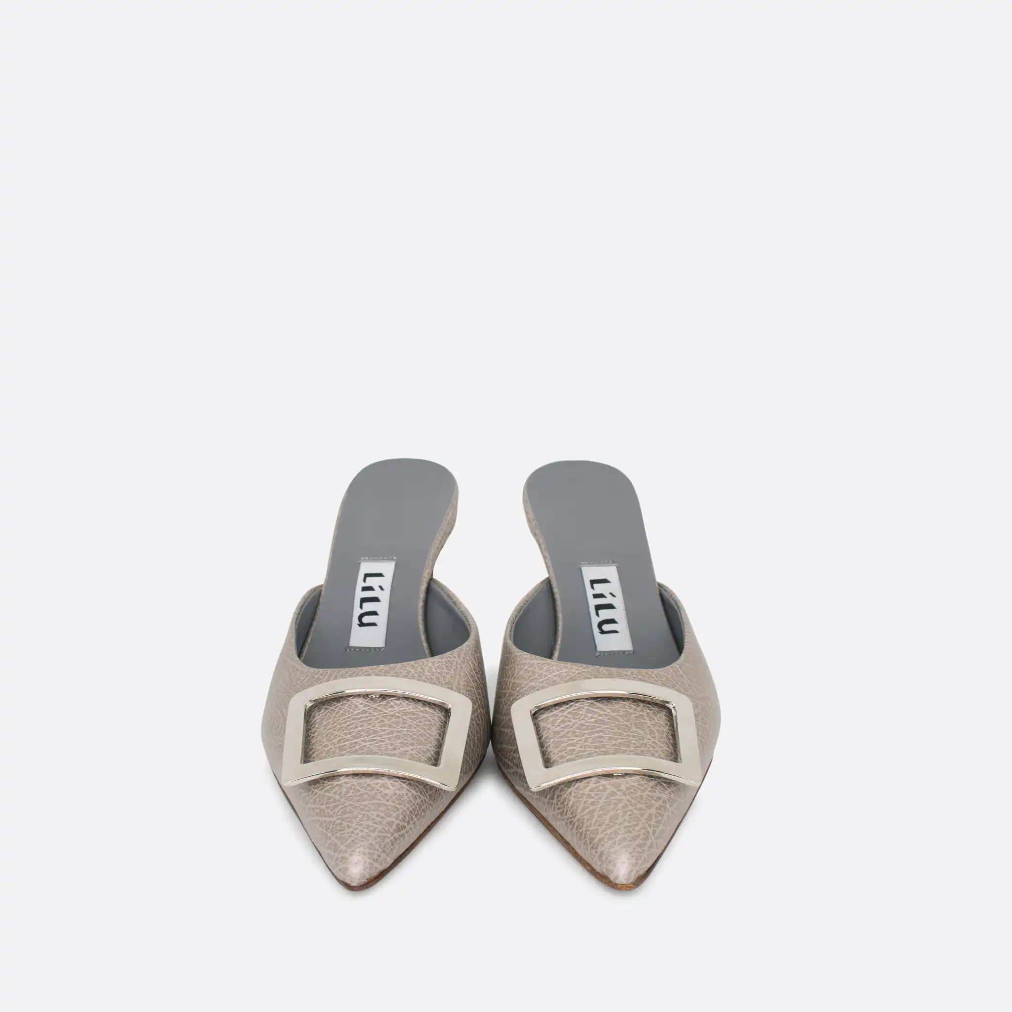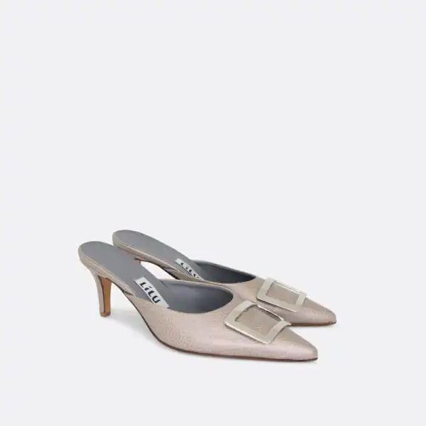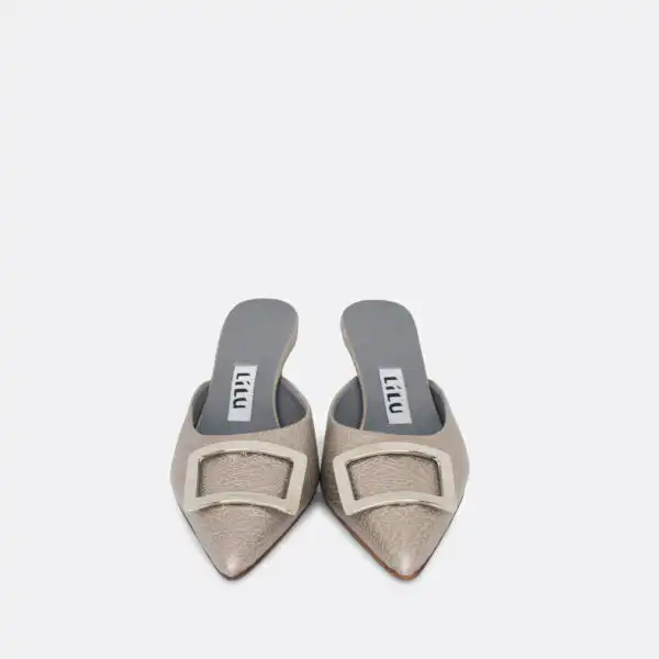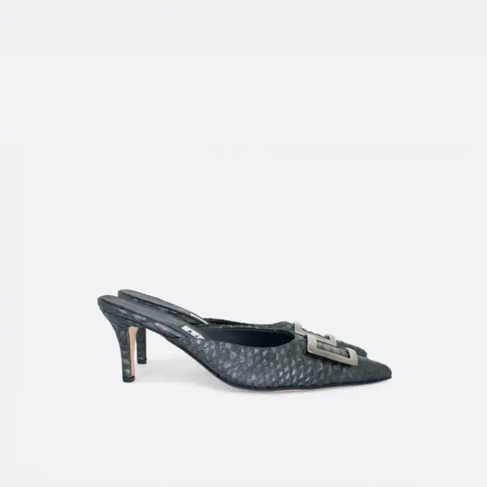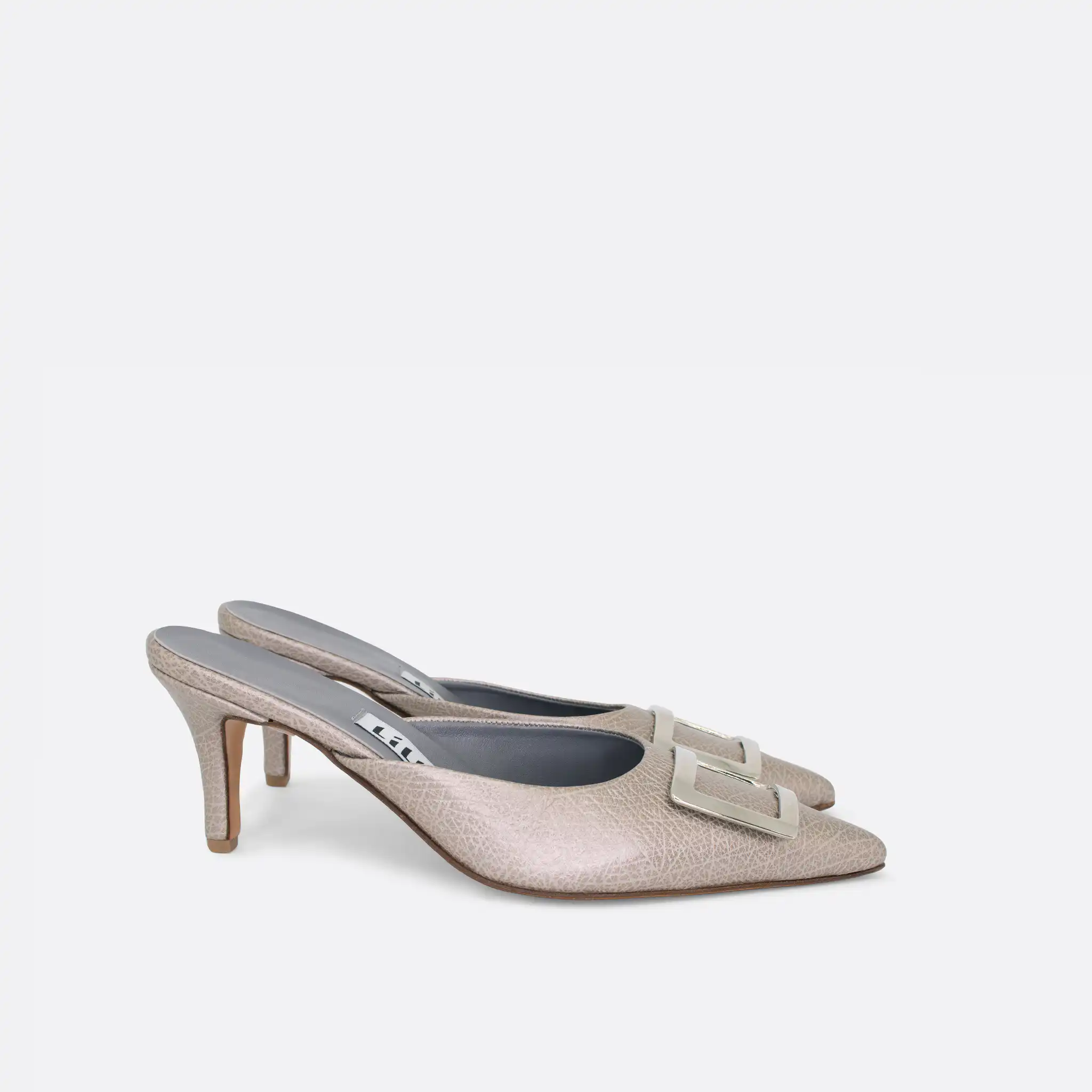 Špicaste elegantne i vrlo udobne papuče sa štiklom od 7 cm i sa ukrasnom srebrnom šnalom. Djon je od kože i zbog toga nije poželjno nositi ih kada su lošije vremenske prilike. U pitanju je ručna izrada obuće u malim, limitiranim serijama. Izradjujemo ih od srebrne reljefne kože. Postava je kožna. Štikla je presvučena u kožu od koje se radi i model. Za naručivanje u posebnim bojama kontaktirajte nas putem e-mail-a.