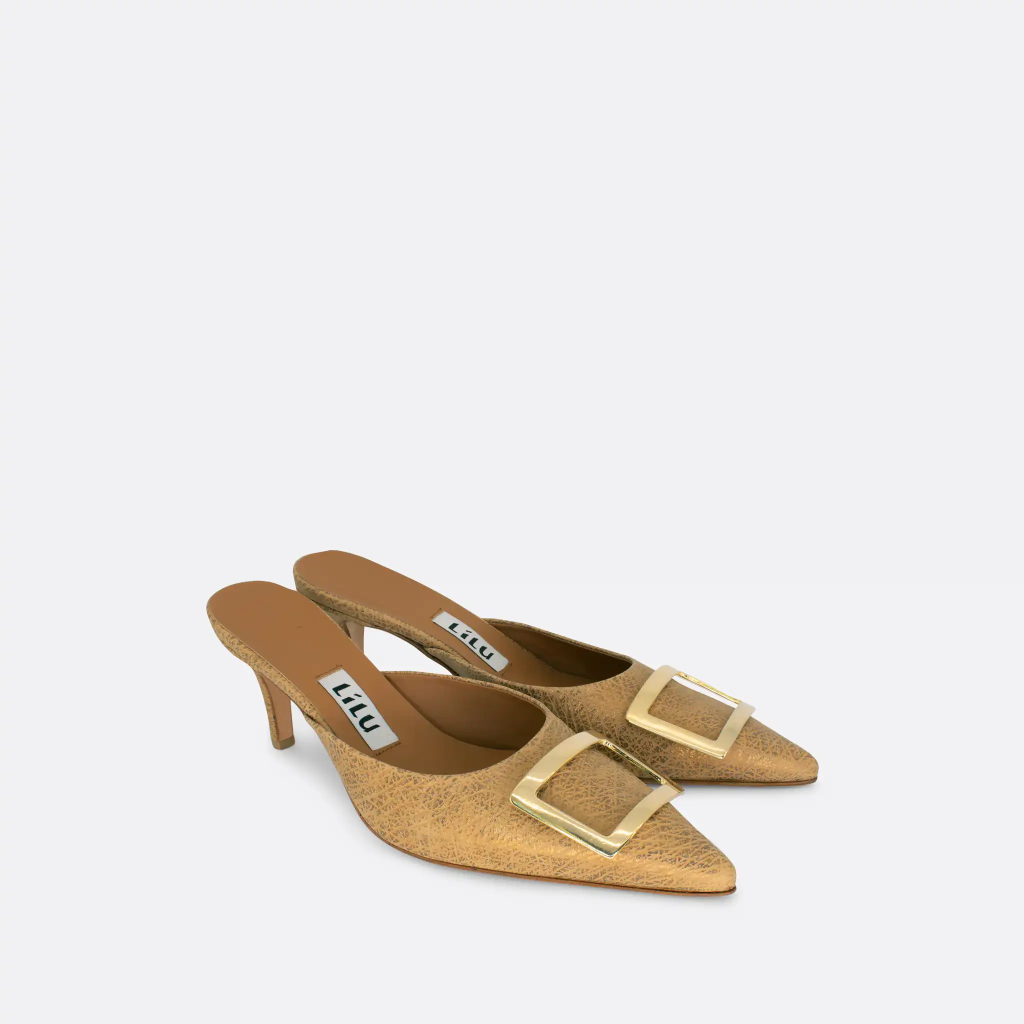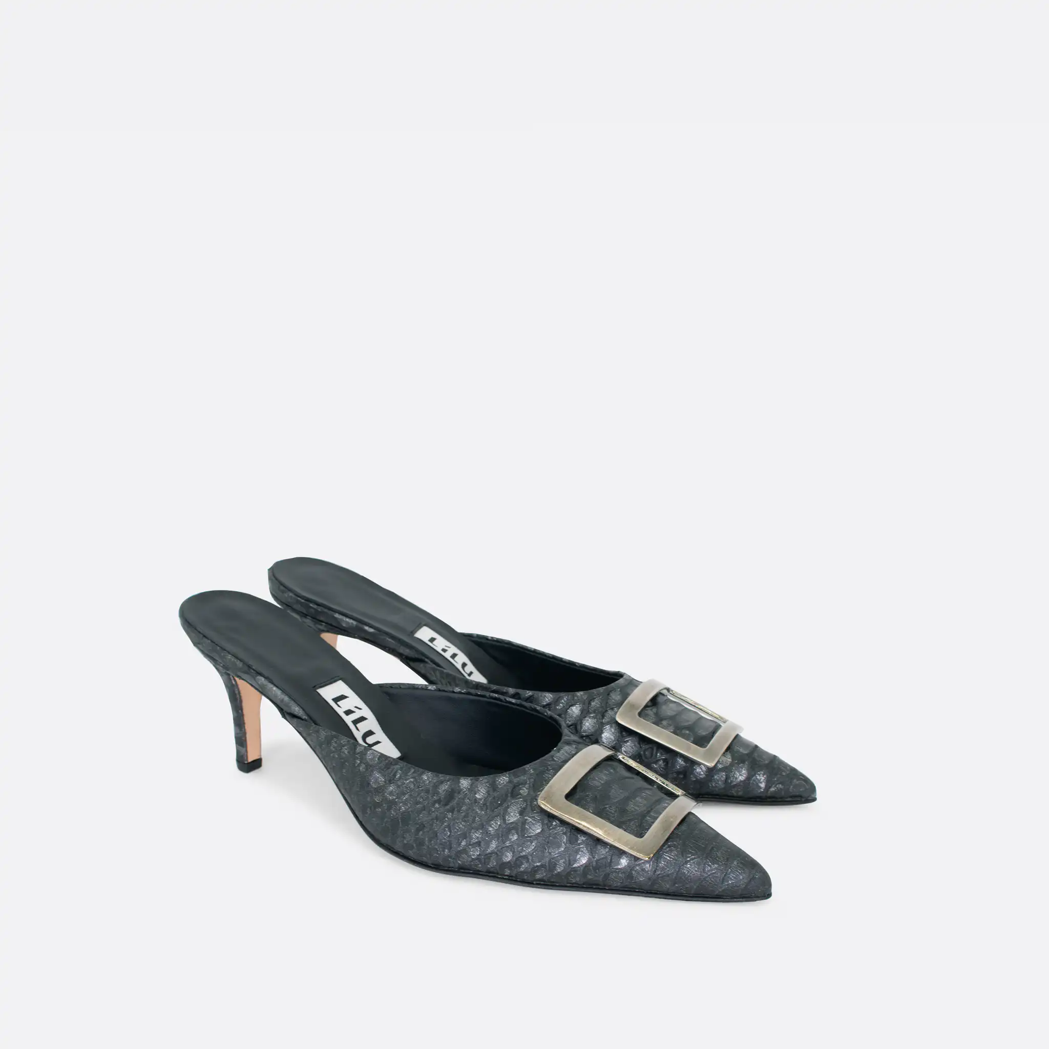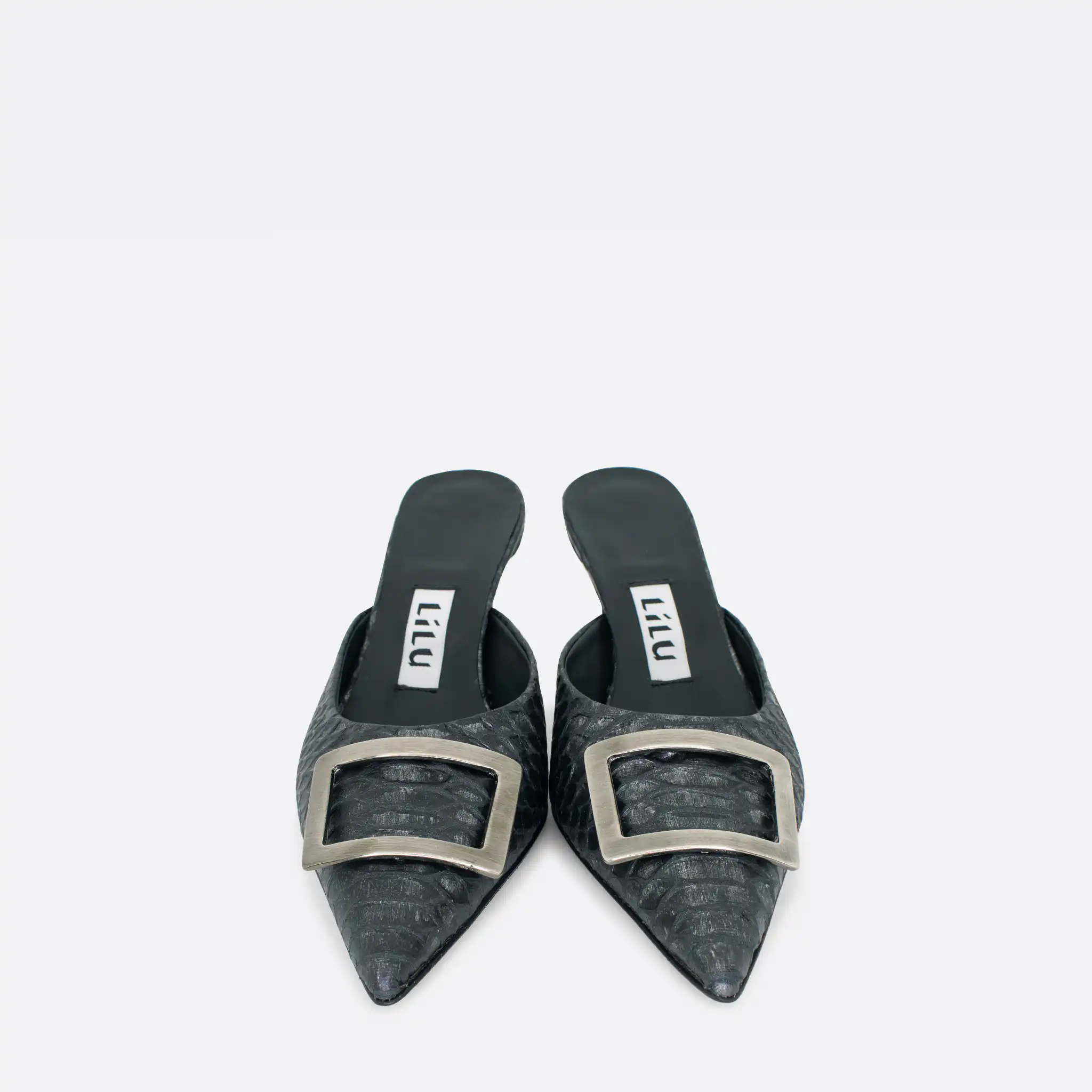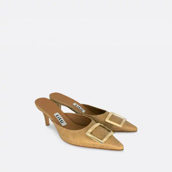 Špicaste elegantne i vrlo udobne papuče sa štiklom od 7 cm i sa ukrasnom srebrnom šnalom. Djon je od kože i zbog toga nije poželjno nositi ih kada su lošije vremenske prilike. U pitanju je ručna izrada obuće u malim, limitiranim serijama. Izradjujemo ih od srebrne, iguana grafitne i zlatne reljefne kože. Postava je kožna. Štikla je presvučena u kožu od koje se radi i model. Za naručivanje u posebnim bojama kontaktirajte nas putem e-mail-a.