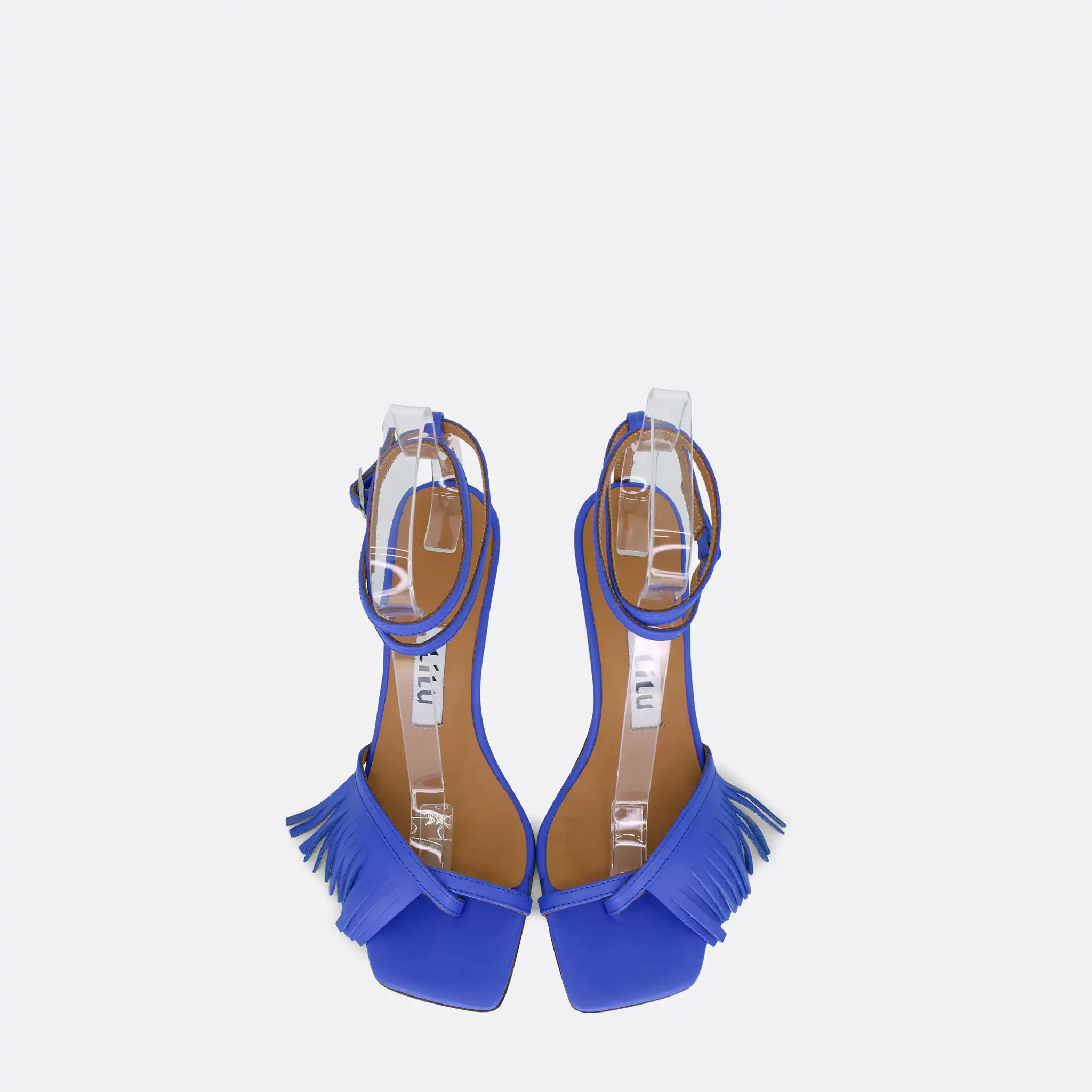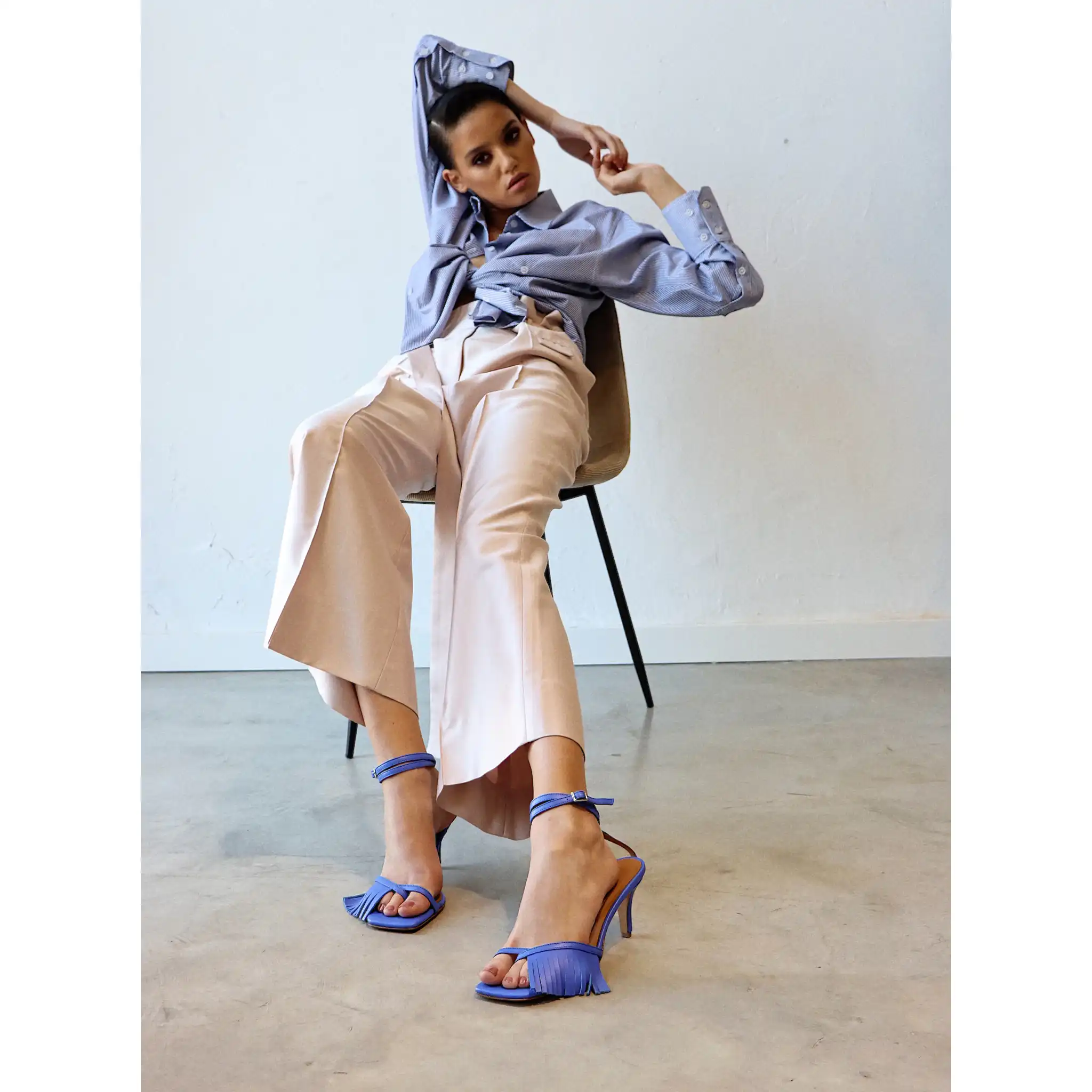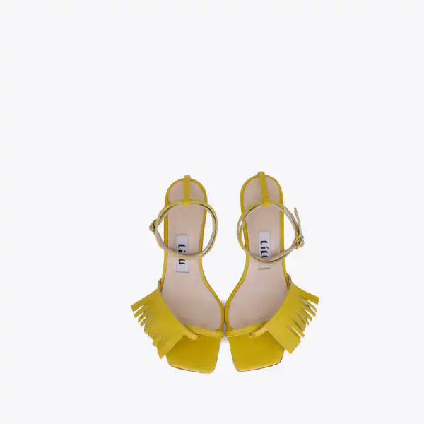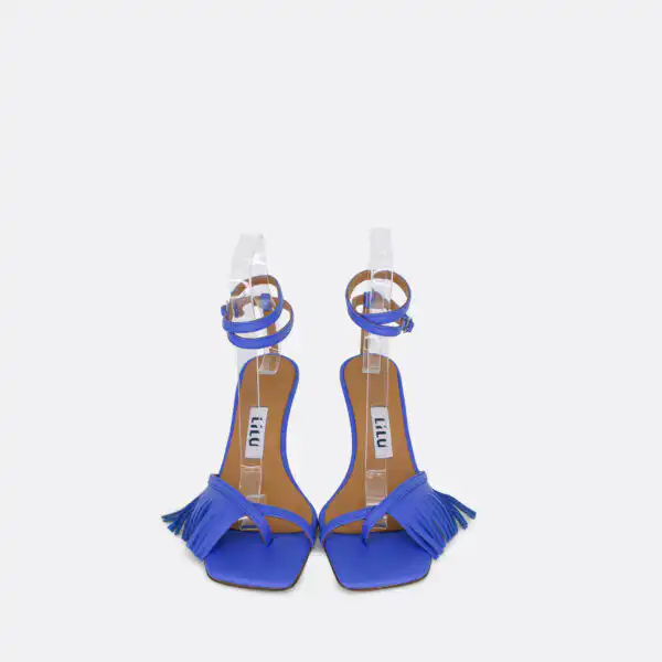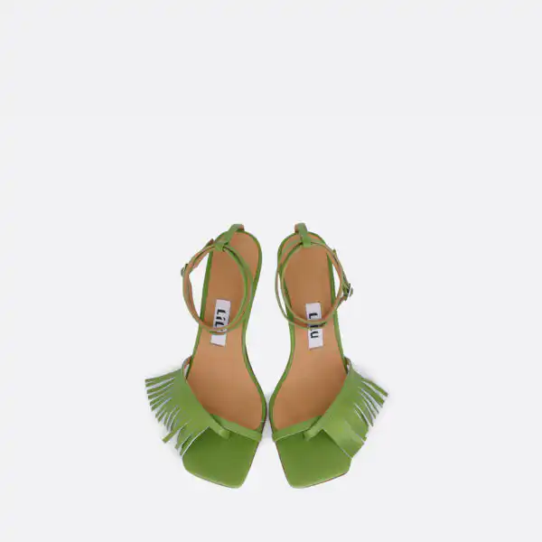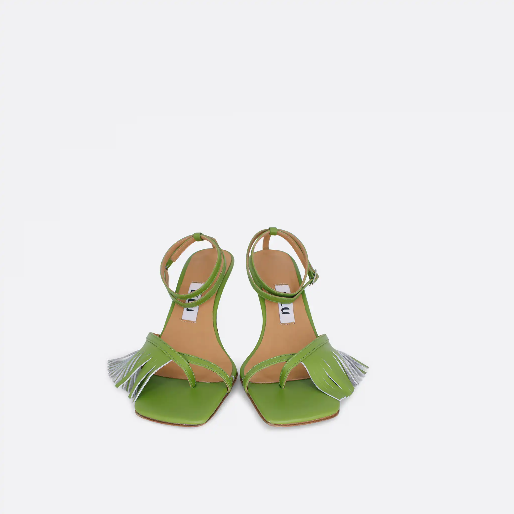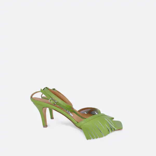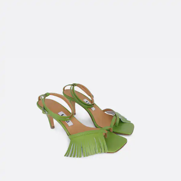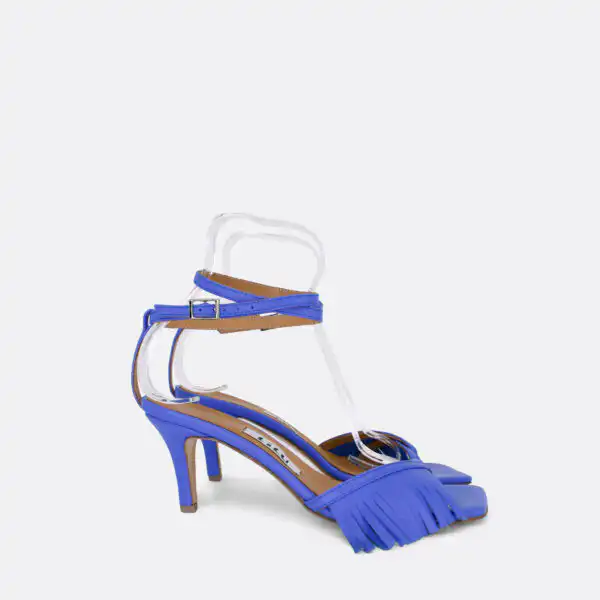Sandale kockastog oblika, sa tankim kaišićima i resama samo u porednjem delu, sa štiklom visine 7 cm, na djonu od kože. Zbog kožnog djona ih ne treba nositi kada su lošije vremenske prilike. Lice i postava su od kože. U pitanju je ručna izrada obuće. Izradjujemo ih u plavoj, žutoj i zelenoj boji, od govedje kože. Za naručivanje u posebnim bojama kontaktirajte nas putem e-mail-a.