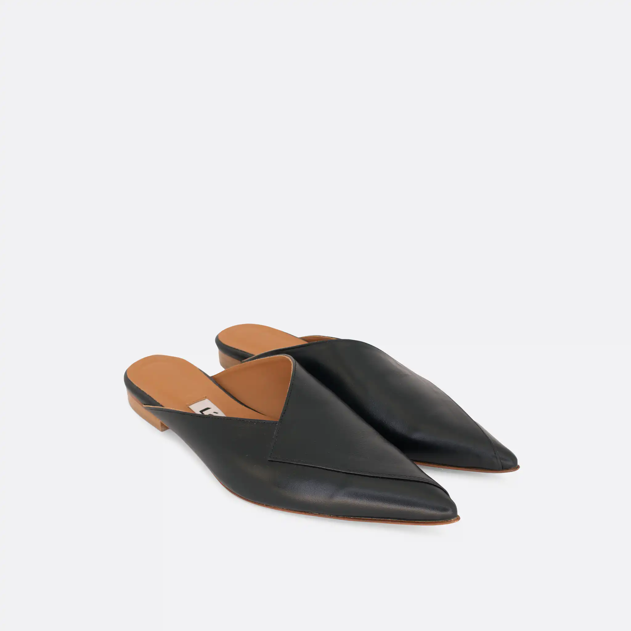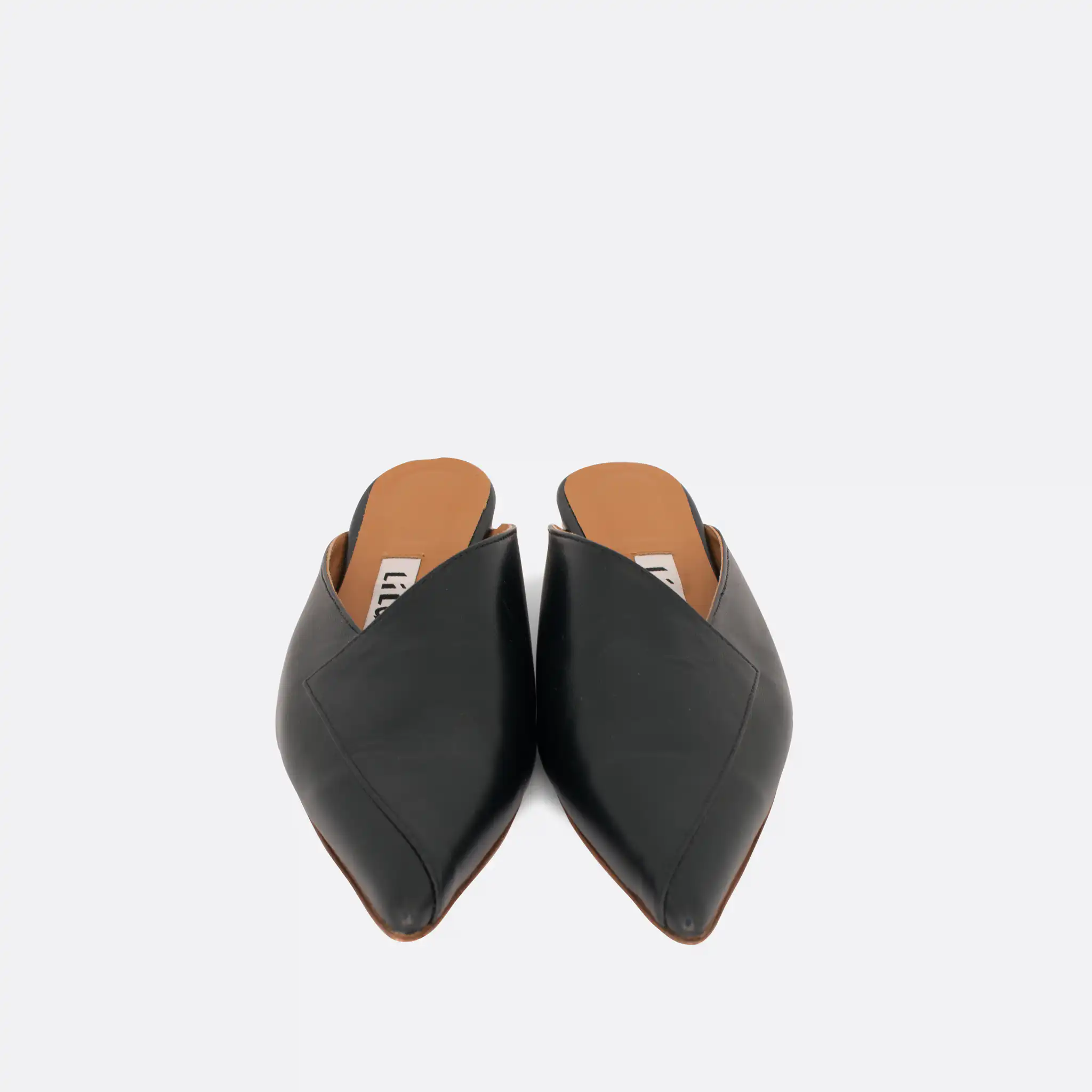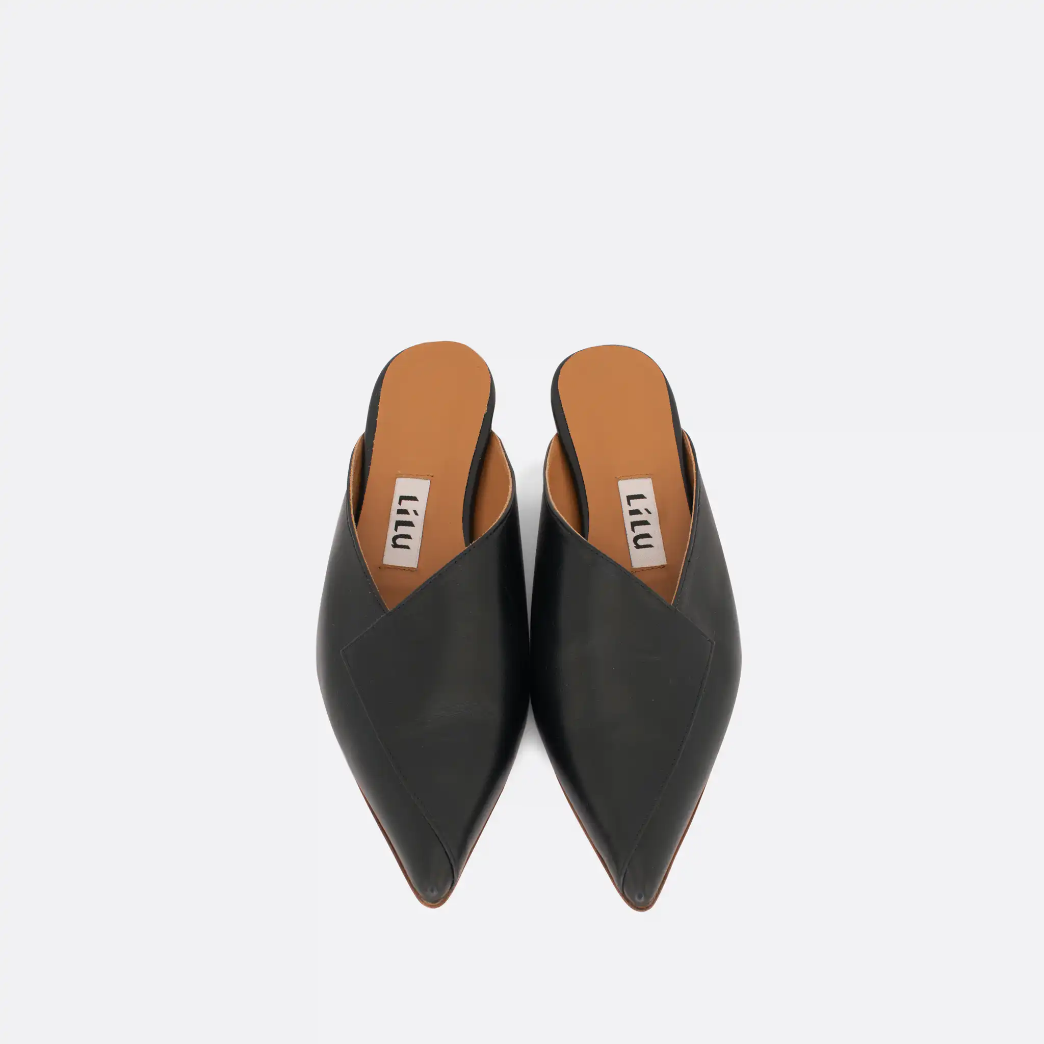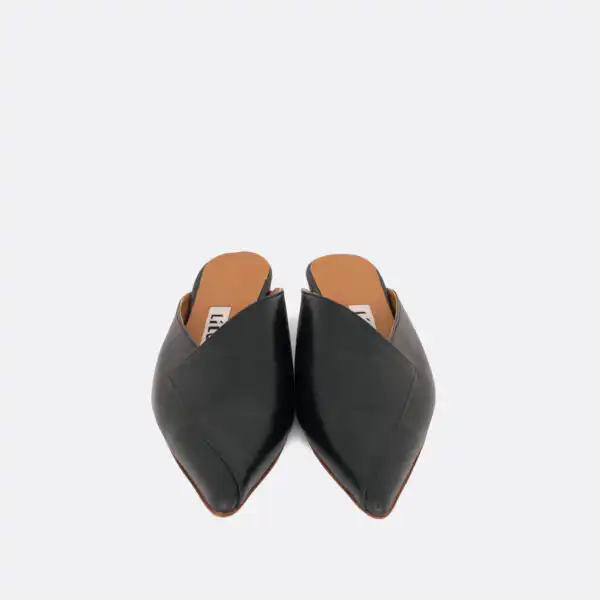 Ravne špicaste asimetrične papuče su izradjene kompletno od kože. Udoban model iz kolekcije LILU LETO 24. Papuče je potrebno birati za broj veće, zbog slobodne pete.